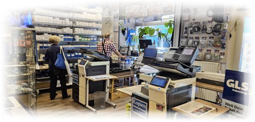 Vor Ort mehrere Kopiermaschinen, Drucker, Fax, Multifunktionsgeräte, Laminiergeräte, Scanner, Kundencomputer, Schneidegeräte, Bindemaschinen und Großformatplotter.