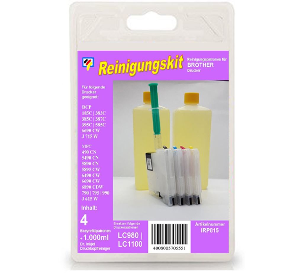 Dr. Inkjet Spezialreinigungspatronen inkl. 1 Liter Düsenreiniger zum entfernen von hartnäckigen Druckkopfverstopfungen Lieferumfang: 4 Spezialpatronen 1x für Schwarz 1x für Cyan 1x für Magenta 1x Yellow + 1000ml Druckkopfreiniger + Nachfüllwerkzeug / Nachfüllspritze mit Nadel Diese Patronen können einzeln und unabhängig verwendet werden.
