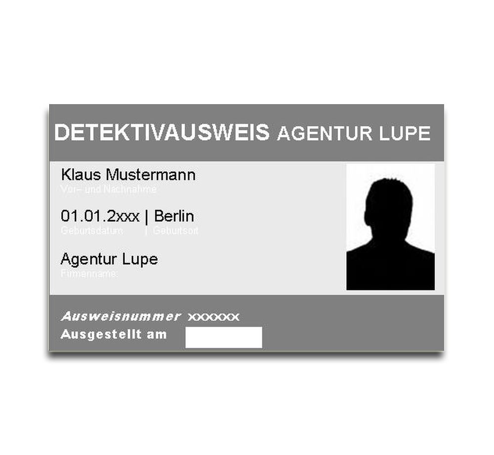 Detektivausweis mit Namen, Geburtstag, Ort, Datum sowie ein Mitarbeiterbild!