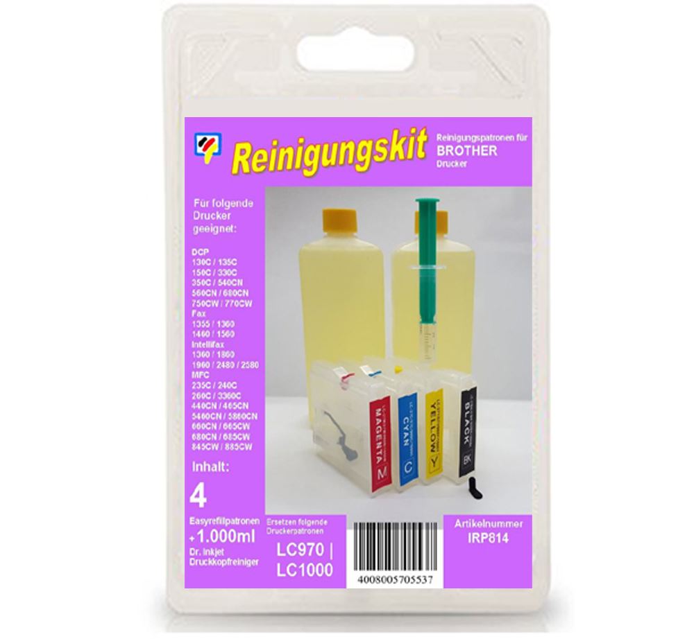 4 Spezialpatronen 1x für Schwarz 1x für Cyan 1x für Magenta 1x Yellow + 1000ml Druckkopfreiniger + Nachfüllwerkzeug / Nachfüllspritze mit Nadel Diese Patronen können einzeln und unabhängig verwendet werden.
