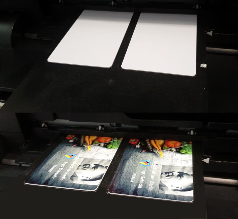 Es geht ganz einfach: den Drucker an den Rechner anschließen und installieren, eine der Vorlagen auswählen. Dann das passende Motiv erstellen und in die Vorlage einsetzen. Druckbefehl auswählen und schon werden die PVC-Karten bedruckt.