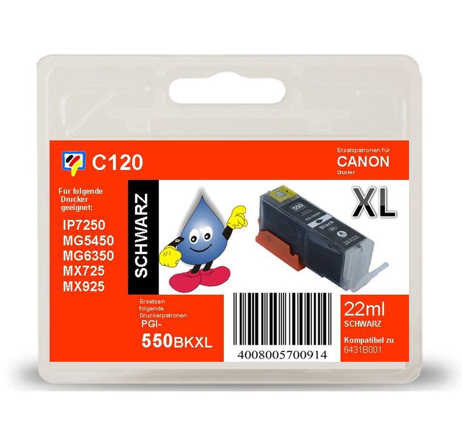 Die Füllmenge von 22ml entspricht der XL Füllung, einer Seitendruckleistung im Entwurfsmodus bei 5% Deckungsgrad von 600 Seiten und ist die größtmögliche Kapazität der schwarzen Canon Druckerpatrone PGI 550XL black.